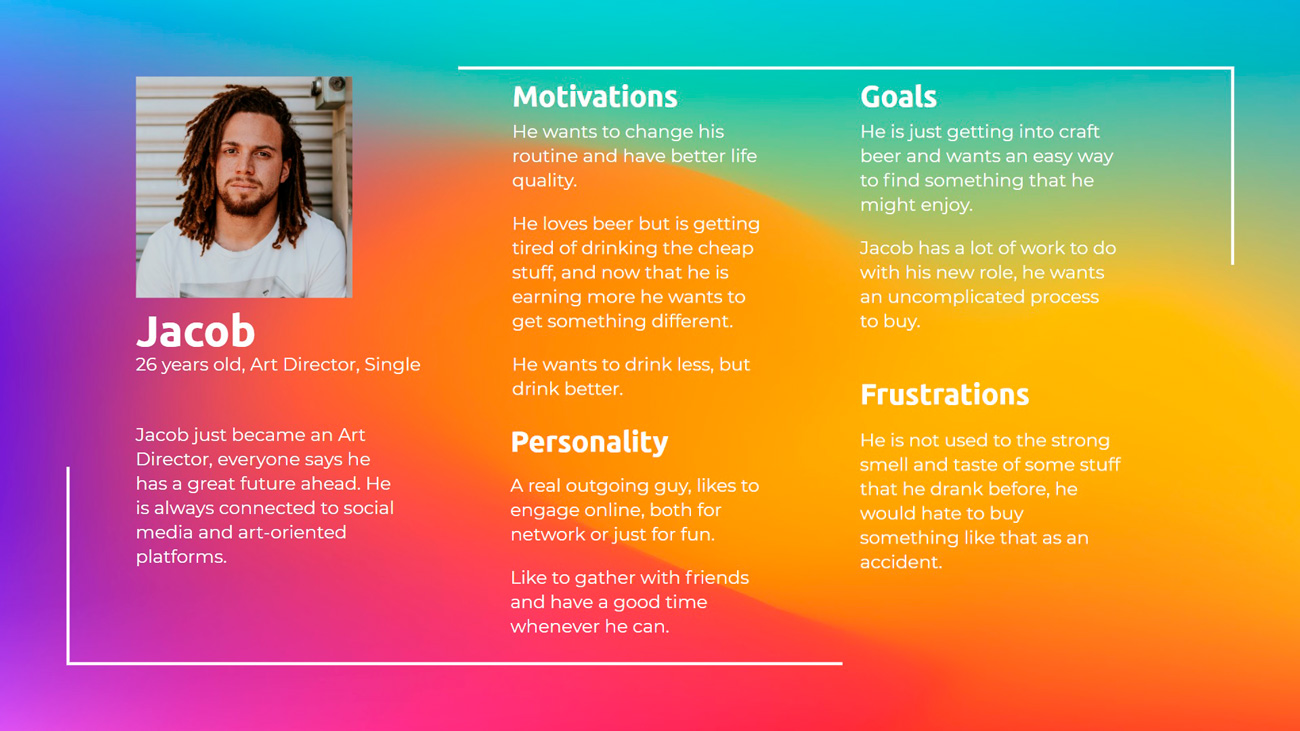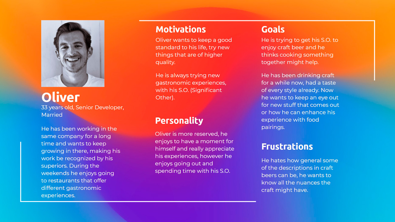 With the demographics defined and the answer to the survey analyzed, it was time to craft a couple of personas. I tried to distill the info obtained from the survey into the persona's motivation and frustrations, bringing them as closer to real scenarios as I could. One was a Beginner tro the craft beer scene and the other one was a Veteran.
