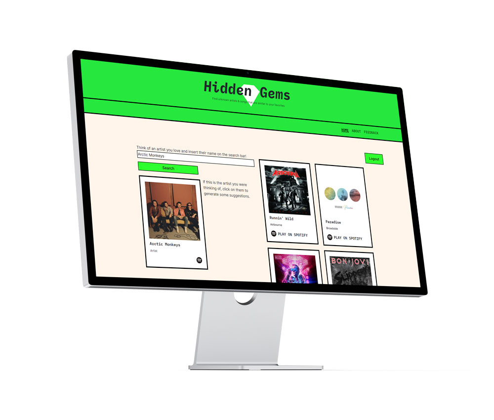 Hidden Gems is a song recommendation tool built using Spotify API and React. Using an artist of your choice it will recommend similar but less known artists inside the platform.